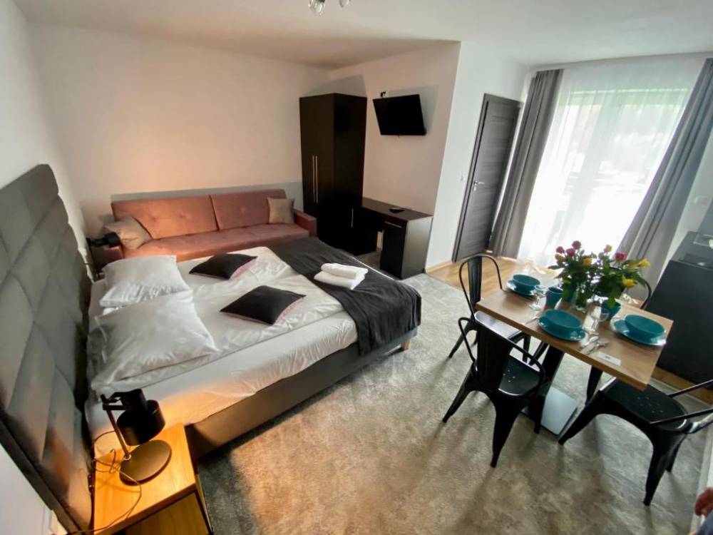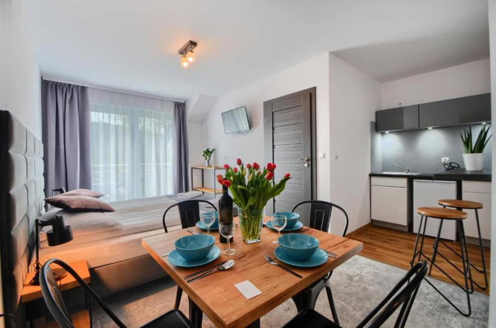 Każdy pokój wyposażony jest w telewizor z płaskim ekranem i obejmuje łazienkę z prysznicem. Do dyspozycji Gości jest także funkcjonalna kuchnia z kuchenką mikrofalową i piekarnikiem.