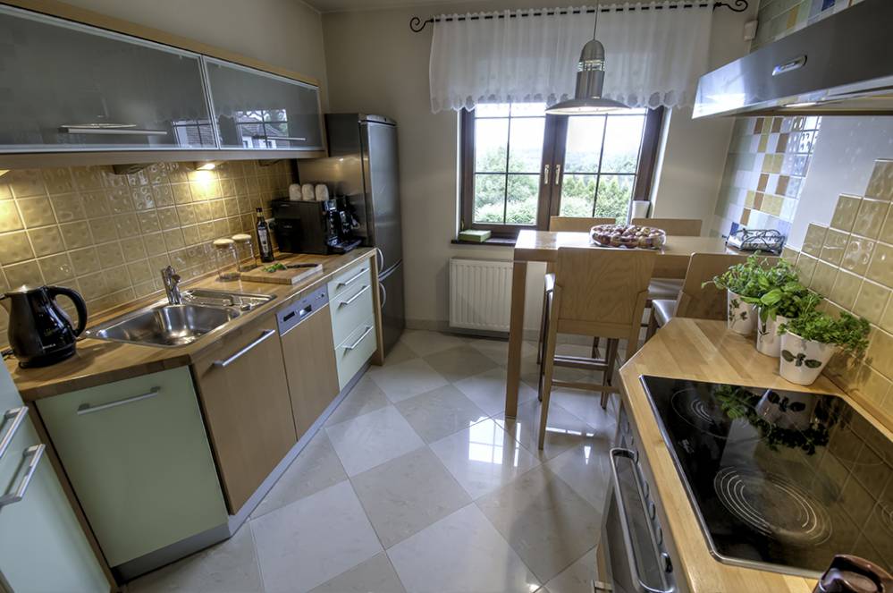 PARTER - 100m2 powierzchni, kuchnia z podstawowym wyposażenie ( lodówka, ceramiczna płyta kuchenna wraz z piekarnikiem,  czajnik bezprzewodowy, naczynia kuchenne, zastawa stołowa, szkło, sztućce),salon kominkowy, część wypoczynkowa (skórzana sofa i 2 fotele), wyposażona w TV SAT, ogród zimowy z meblami ratanowymi, sypialnia – Classic Room Garden I, toaleta.