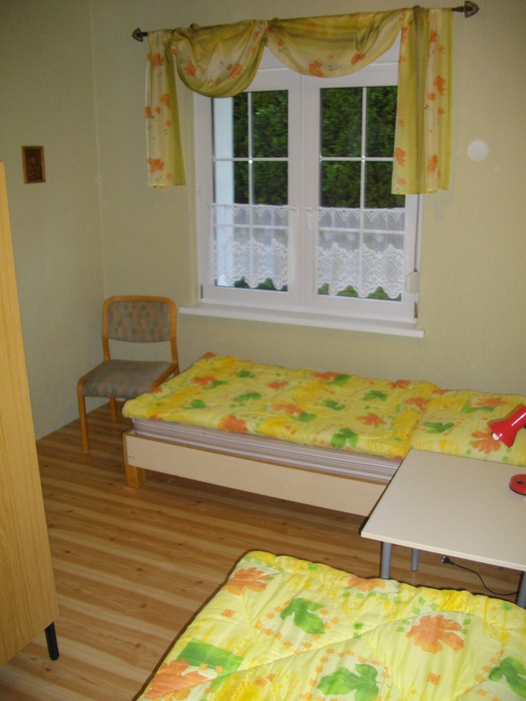 Na piętrze domku są 4 pokoje (2-osobowy, 3-osobowy, 2x4-osobowy) oraz łazienka z prysznicem.