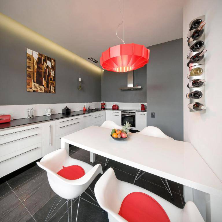 Apartament jest kompleksowo wyposażony, zapewniając Państwu wygodny pobyt. Komfort apartamentu, jego walory estetyczne oraz niezwykła lokalizacja są wysoko oceniane przez naszych Gości. Wnętrze apartamentu odznacza się designerskim wystrojem w kontrastujących kolorach czerni, bieli i czerwieni. Do dyspozycji Gości jest telewizor z płaskim ekranem i dostępem do kanałów telewizji satelitarnej, 2 sypialnie, część wypoczynkowa, jak również kompletnie wyposażony aneks kuchenny ze zmywarką do naczyń i ekspresem do kawy. W łazience znajduje się prysznic i suszarka do włosów. Cena zakwaterowania w apartamencie ST1 obejmuje bezprzewodowy dostęp do Internetu.