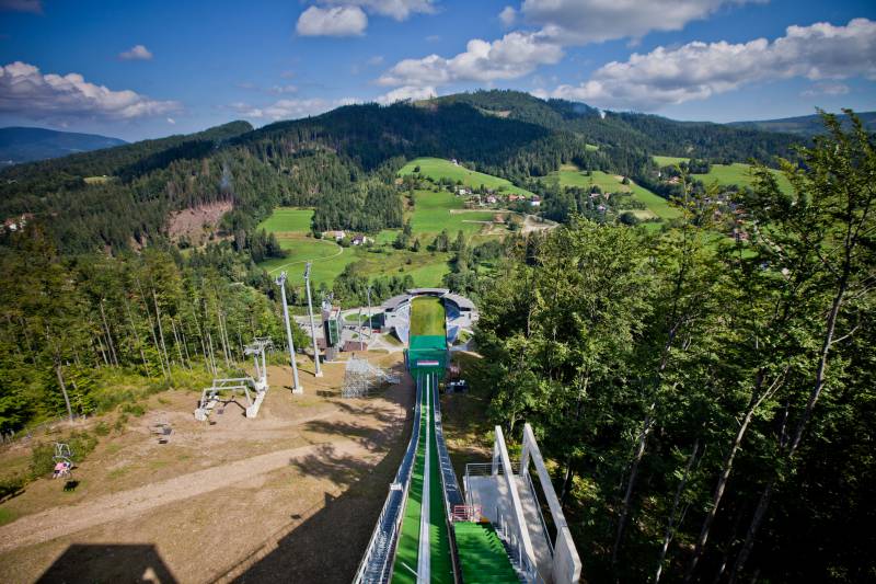 Rozciąga się z tego miejsca imponujący widok na rozbieg i zeskok skoczni. Zjazd na dół odbywa się koleją krzesełkową. Z parkingu przy skoczni dochodzimy na ścieżkę pieszo-rowerową, prowadzącą brzegiem potoku Malinka, która jest jednocześnie ścieżką edukacyjno-dydaktyczną.
