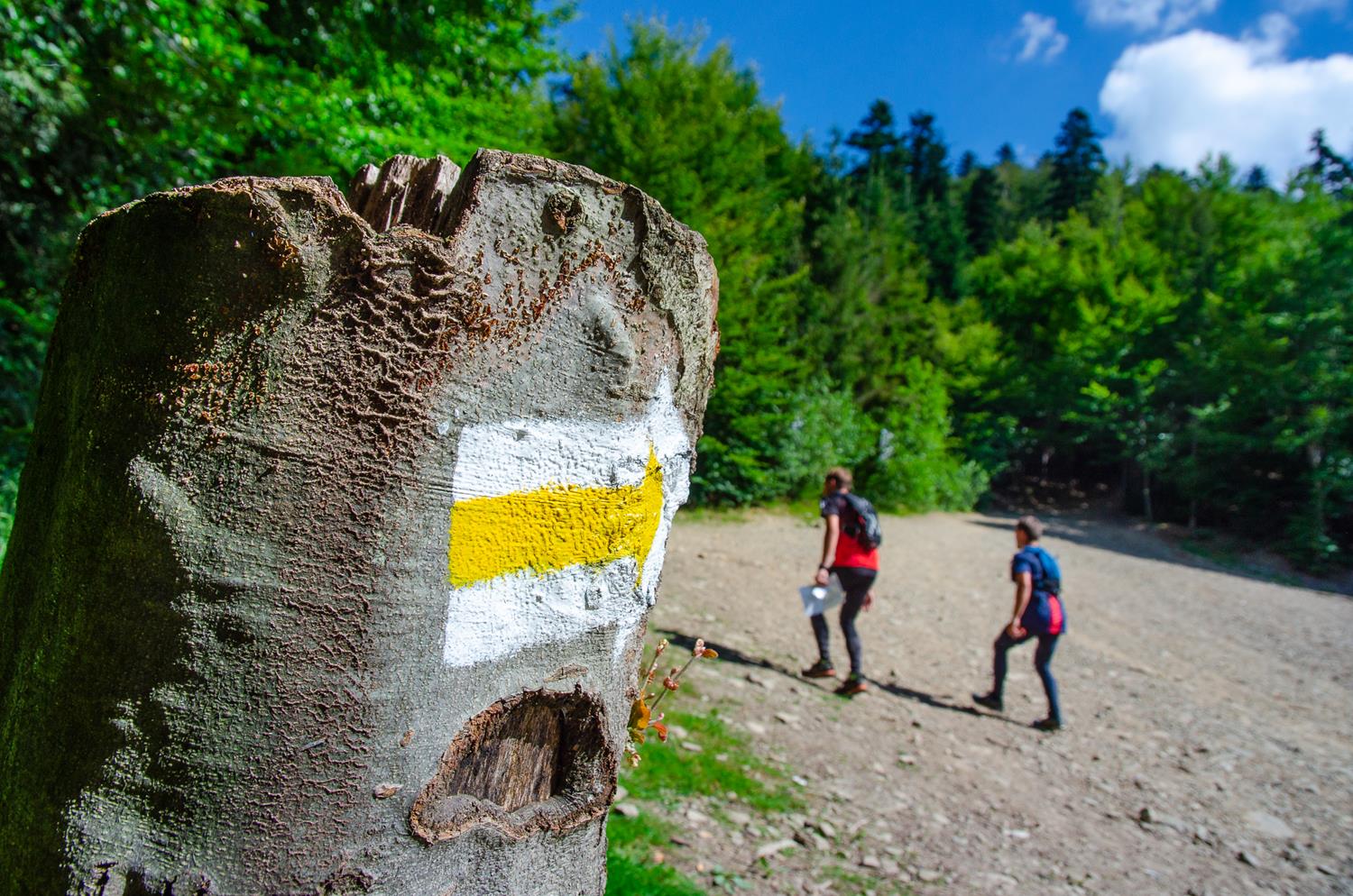 Szlak: żółty z Jeleśni do rozstaju pod szczytem Gachowizny, niebieski z Gachowizny do Huciska