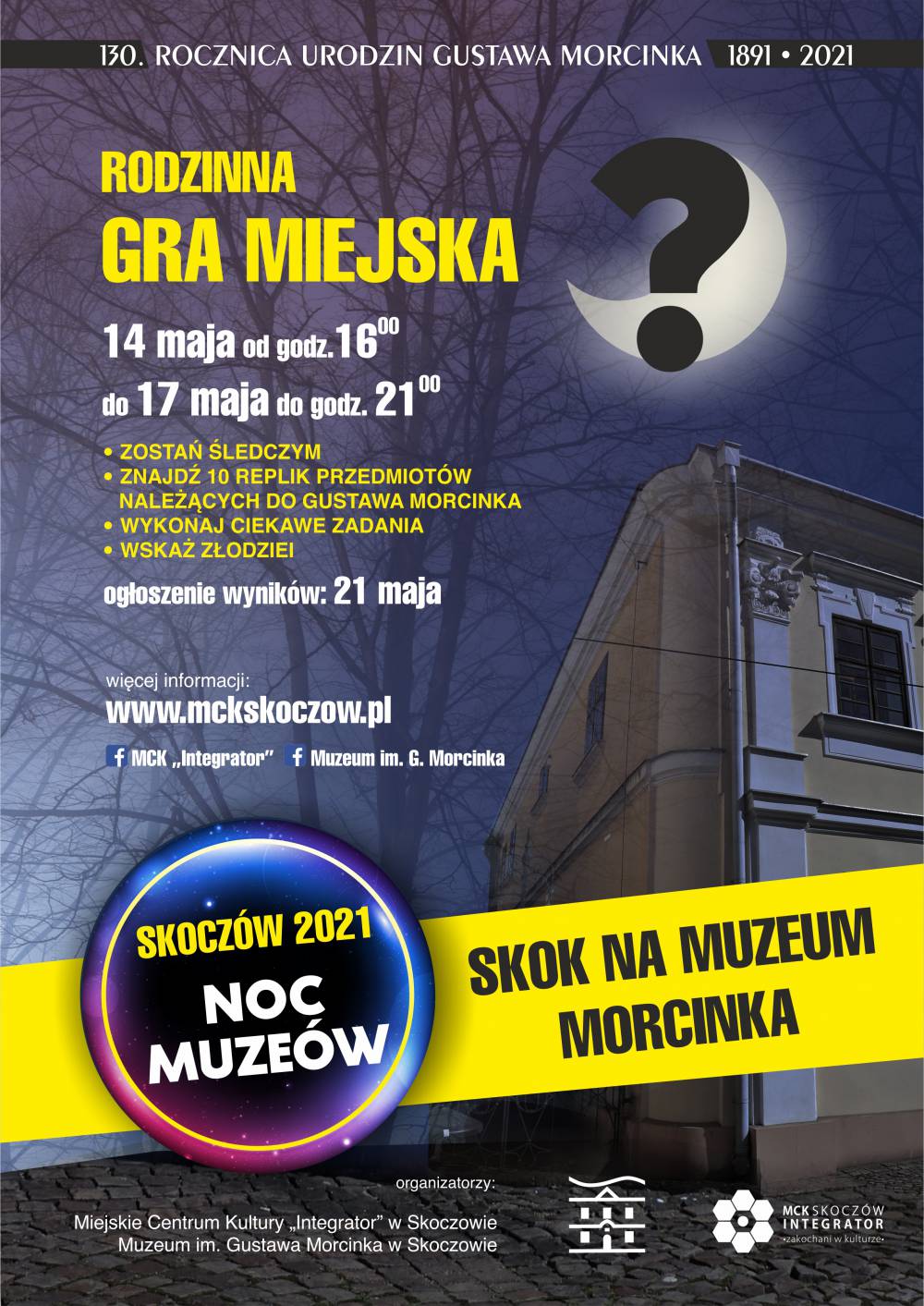 Rodzinna gra miejska SKOK NA MUZEUM MORCINKA została przygotowana z okazji ogólnopolskiego projektu „Noc Muzeów”. MCK „Integrator” we współpracy z Muzeum im. Gustawa Morcinka opracowało ją z myślą o przybliżeniu uczestnikom gry sylwetki pisarza związanego przez lata ze Skoczowem oraz w celu popularyzacji jego twórczości. Okazja do stworzenia gry pojawiła się dzięki uchwale Rady Miejskiej Skoczowa, która ogłosiła rok 2021, rokiem Gustawa Morcinka.