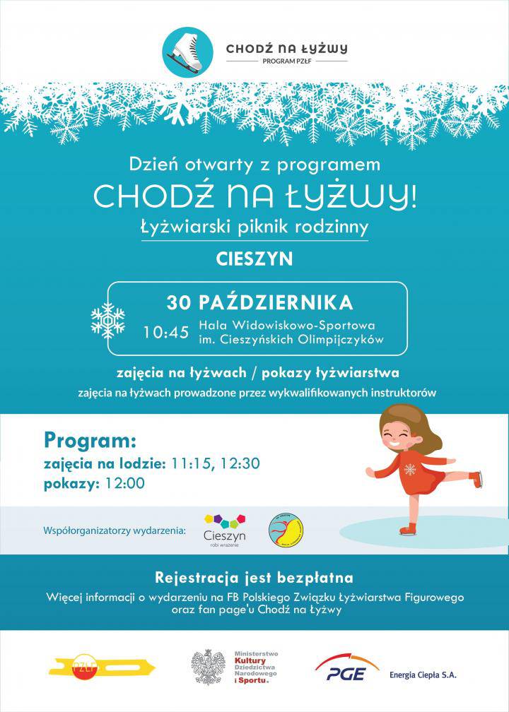 W sobotę 30 października 2021 roku wydarzenie promujące program Polskiego Związku Łyżwiarstwa Figurowego “Chodź na Łyżwy” ponownie zawita do Cieszyna. Impreza rozpocznie się 30 października o godzinie 10:45 na Hali Widowiskowo-Sportowej im. Cieszyńskich Olimpijczyków przy ul. Sportowej 1 i potrwa do godziny 13:15. Wstęp bezpłatny. Program jest realizowany dzięki wsparciu PGE Energia Ciepła oraz współpracy z Ministerstwem Kultury, Dziedzictwa Narodowego i Sportu.