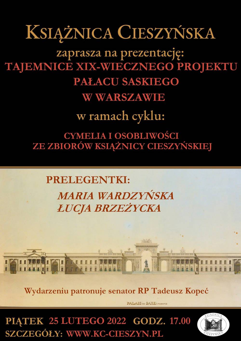Warszawskie Stowarzyszenie Saski 2018 stawia sobie za cel doprowadzenie do odbudowy Pałacu Saskiego, a tym samym restytucji zachodniej pierzei placu Piłsudskiego. Specjalistka przedstawi historię Pałacu Saskiego, współczesne koncepcje jego odbudowy, a także szanse na realizację tej inwestycji. Prezentacja „Tajemnice XIX-wiecznego projektu Pałacu Saskiego w Warszawie” odbędzie się w sali konferencyjnej Książnicy Cieszyńskiej przy ul. Menniczej 46 z zachowaniem obowiązującego rygoru sanitarnego. Wydarzeniu patronuje senator RP Tadeusz Kopeć.