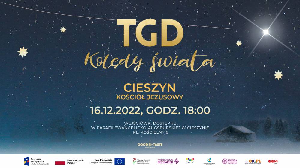 Parafia Ewangelicko-Augsburska w Cieszynie i Cieszyński Ośrodek Kultury "Dom Narodowy" zapraszają na koncert Kolędy Świata zespołu TGD (Trzecia Godzina Dnia), który odbędzie się w piątek 16 grudnia w Kościele Jezusowym w Cieszynie!