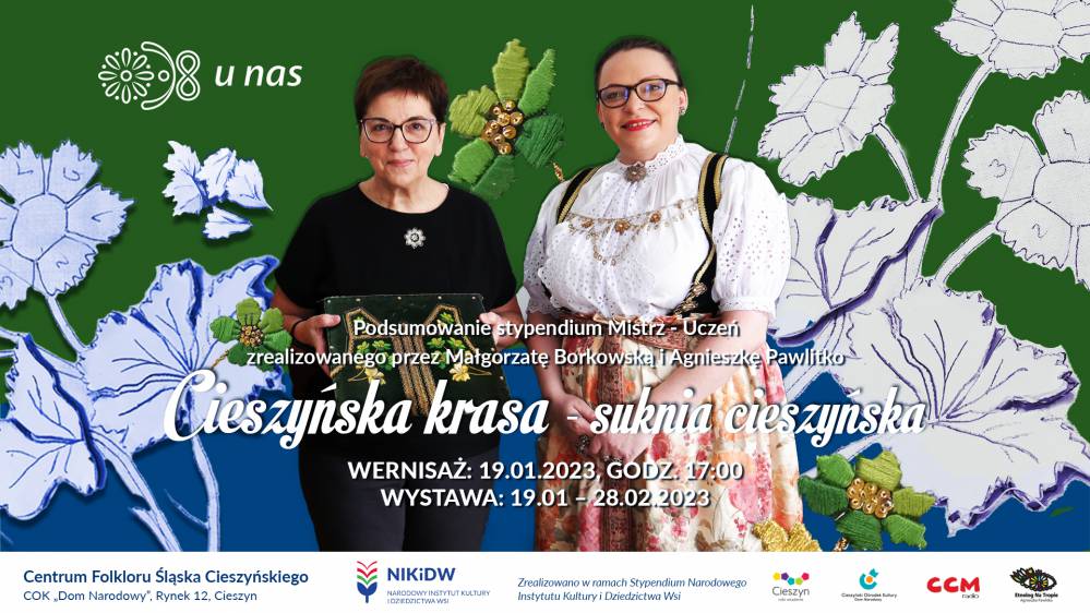 Cieszyński Ośrodek Kultury "Dom Narodowy" zaprasza na wystawę „Cieszyńska krasa – suknia cieszyńska” podsumowującej stypendium Mistrz-Uczeń zrealizowanego przez Małgorzatę Borkowską i Agnieszkę Pawlitko. Wystawa będzie miała miejsce w Centrum Folkloru Śląska Cieszyńskiego - drugie piętro Domu Narodowego w Cieszynie i potrwa od 19 stycznia do 28 lutego 2023 r. Wernisaż wystawy odbędzię się w czwartek, 19 stycznia 2023r. o godzinie 17:00.