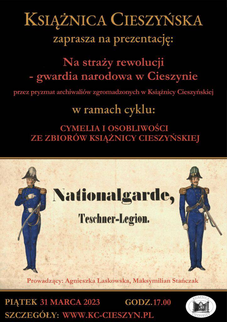 W ostatni piątek miesiąca, 31 marca 2023 r. o godz. 17.00, Książnica Cieszyńska zaprasza na prezentację z cyklu „Cymelia i osobliwości ze zbiorów Książnicy Cieszyńskiej. Tym razem prezentacja nosi tytuł „Na straży rewolucji – Gwardia Narodowa w Cieszynie przez pryzmat archiwaliów zgromadzonych w Książnicy Cieszyńskiej”, a poprowadzą ją Agnieszka Laskowska i Maksymilian Stańczak.