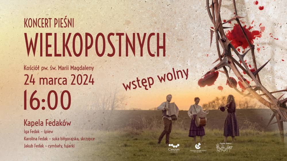 Cieszyński Ośrodek Kultury zaprasza na koncert pieśni wielkopostnych w wykonaniu Kapeli Fedaków. Koncert odbędzie się w niedzielę 24 marca 2024, o godzinie 16:00 w Kościele pw. św. Marii Magdaleny w Cieszynie. Wydarzenie organizowane jest w ramach cieszyńskiego Jarmarku Wielkopostnego. Wstęp wolny.