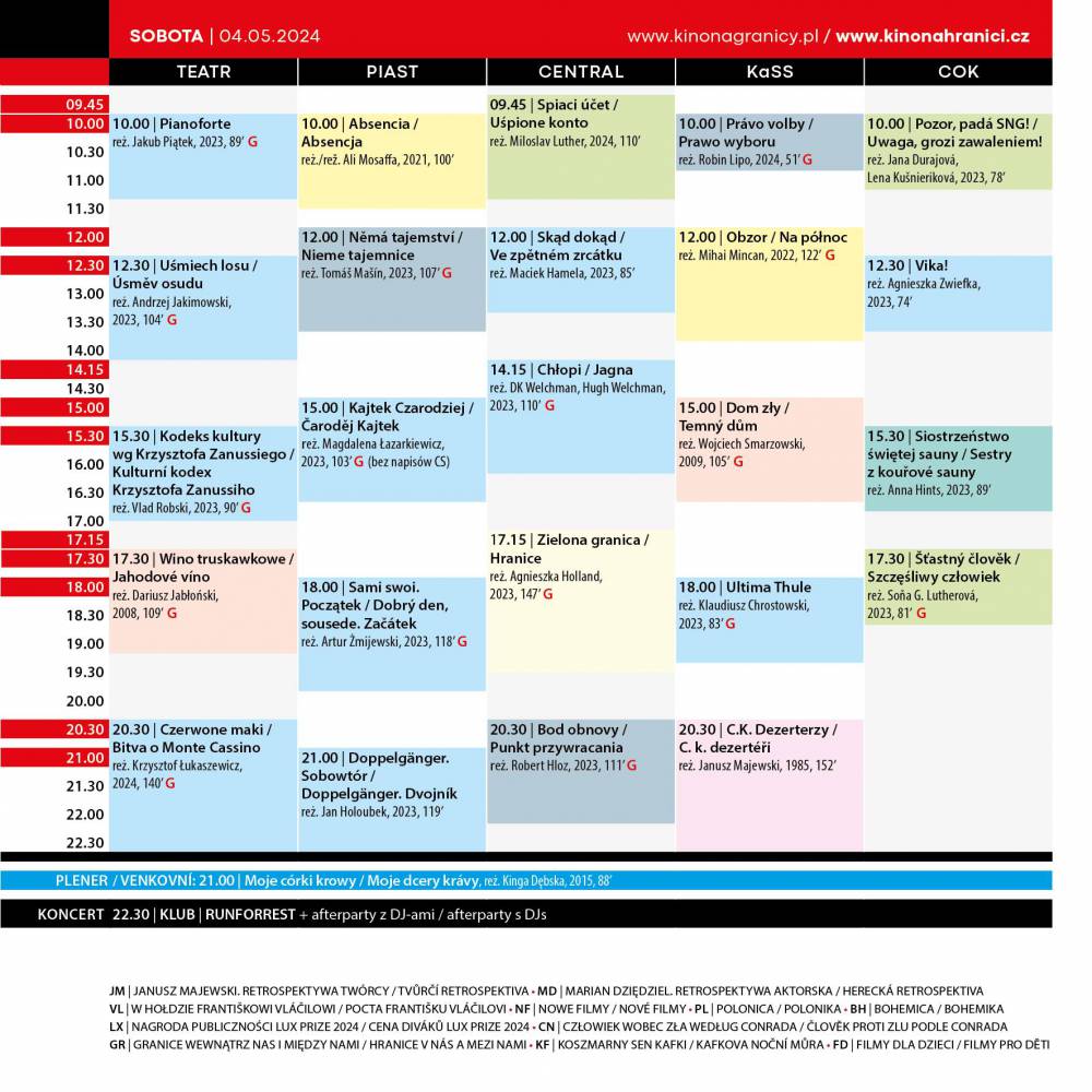 Kino Na Granicy / Kino Na Hranici to co roku: 5 dni festiwalu, co najmniej 4 miejsca projekcji w jednym, choć podwójnym mieście, ponad 100 filmów, koncerty i mnóstwo wydarzeń towarzyszących: wystawy, dyskusje i spotkania z twórcami oraz warsztaty.