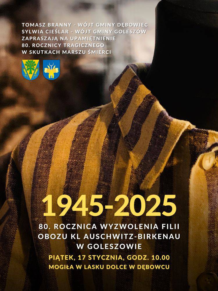 W tym roku przypada 80. rocznica wyzwolenia podobozu KL Auschwitz-Birkenau w Goleszowie oraz tragicznego w swych skutkach marszu śmierci. W dniach 18 i 19 stycznia, około 1000 więźniów szło pod przymusem z Goleszowa do Wodzisławia. Tych, co przetrwali kilkudziesięciokilometrowy marsz w mroźnych warunkach, załadowano do wagonów i wywieziono do obozów na terenie Rzeszy Niemieckiej. Wielu z nich zmarło jednak w drodze, z głodu i wyczerpania, a niejednokrotnie od strzałów esesmańskich konwojentów. Pierwsza mogiła na trasie tego „Marszu Śmierci” znajduje się na terenie sąsiedniej gminy Dębowiec, gdzie na polu Dolce pod laskiem pochowano ciała 19 ofiar, stąd też uroczystości związane z upamiętnieniem tego wydarzenia odbędą się właśnie tam. Do udziału w wydarzeniu zaplanowanym na piątek, 17 stycznia o godz. 10.00 zaprasza Sylwia Cieślar – Wójt Gminy Goleszów oraz Tomasz Branny – Wójt Gminy Dębowiec.
