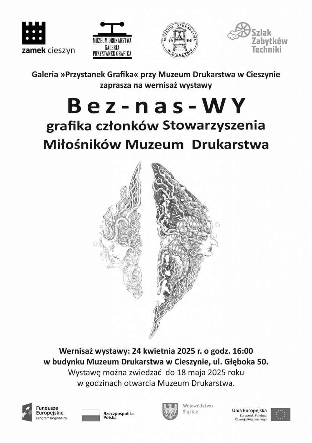 Muzeum Drukarstwa w Cieszynie zaprasza wystawę "Bez-nas-WY grafika członków Stowarzyszenia Miłośników Muzeum Drukarstwa". Wernisaż wystawy odbędzie się 24 kwietnia 2025r o godzinie 16:00 i będzie można ją zwiedzać do 18 maja 2025r.