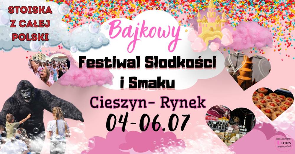 Zapraszamy 4–6 lipca do Cieszyna na Bajkowy Festiwal Słodkości i Smaku. Zanurz się w bajkowy świat smaków, kolorów i niezapomnianej zabawy! Przez trzy dni serce Cieszyna zamieni się w magiczne miasteczko pełne radości – dla małych i dużych!