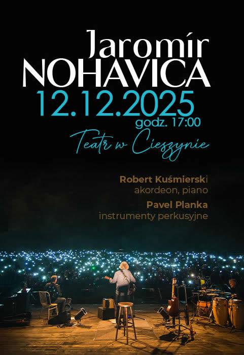 Zapraszamy 12 grudnia 2025 do Teatru im. Adama Mickiewicza w Cieszynie na dwa koncerty: Jaromir Nohavica, Robert Kuśmierski - akordeon, piano, Pavel Planka - instrumenty perkusyjne.
