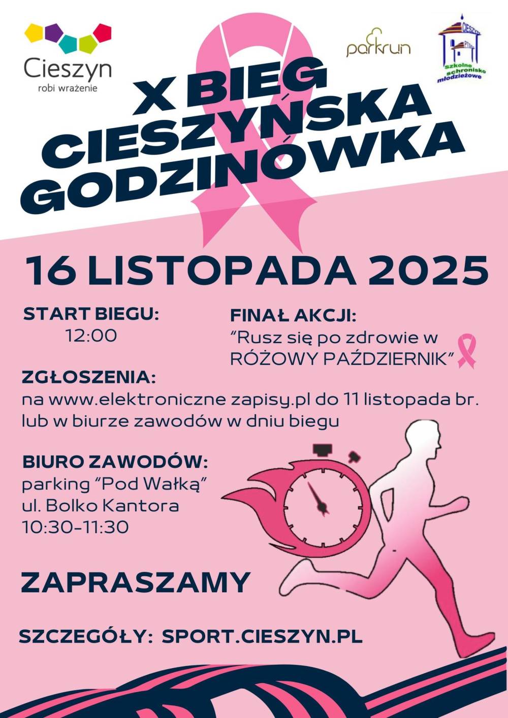 Wydział Sportu Urzędu Miejskiego w Cieszynie, Szkolne Schronisko Młodzieżowe w Cieszynie zapraszają do wzięcia udziału w X Biegu Cieszyńska Godzinówka, który odbędzie się 16 listopada 2025 roku w Cieszynie!