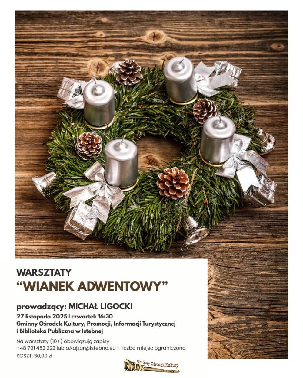 Chcesz poczuć magię zbliżających się świąt i stworzyć własną, piękną dekorację? Zapraszamy na wyjątkowe warsztaty, podczas których pod okiem prowadzącego Michała Ligockiego wykonasz swój niepowtarzalny wianek adwentowy.