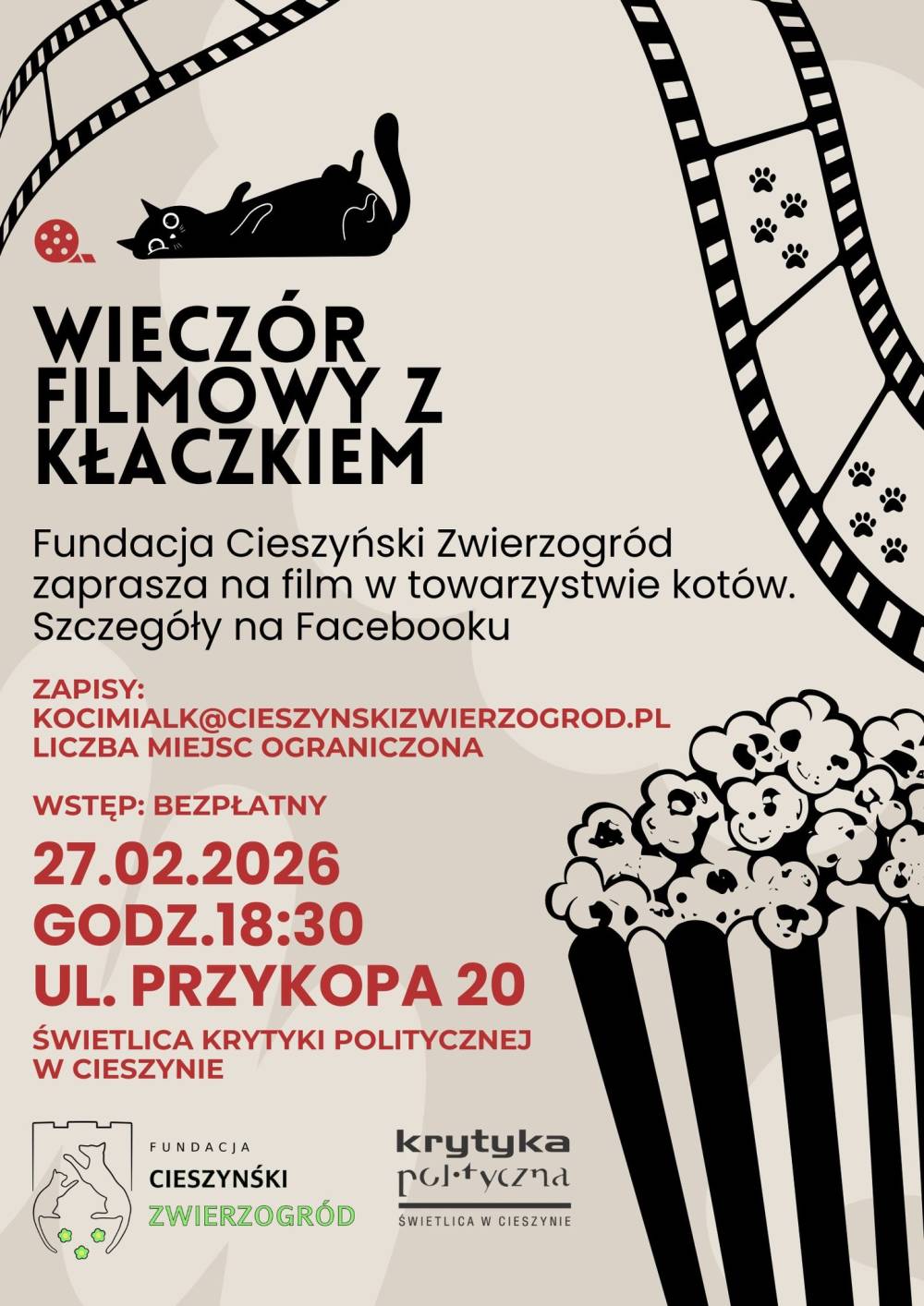 Fundacja Cieszyński Zwierzogród oraz Świetlica Krytyki Politycznej w Cieszynie zapraszają na Wieczór Filmowy z Kłaczkiem. Jeśli lubisz dobry film i koty, to to wydarzenie jest właśnie dla Ciebie!