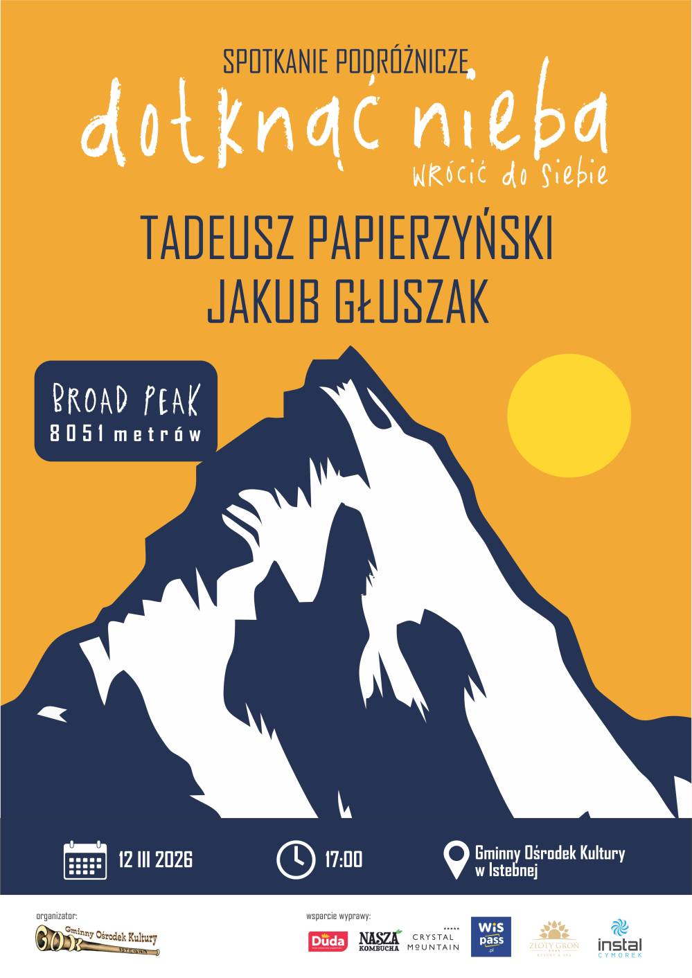 Gminny Ośrodek Kultury w Istebnej serdecznie zaprasza na spotkanie podróżnicze z Tadeuszem Papierzyńskim oraz Jakubem Głuszakiem - Dotknąć Nieba wrócić do siebie, które odbędzie się w czwartek 12 marca w siedzibie Gminnego Ośrodka Kultury w Istebnej. Motywem przewodnim spotkania będzie wyprawa na Broad Peak.  Ośmiotysięcznik zlokalizowany na granicy Chin i Pakistanu.