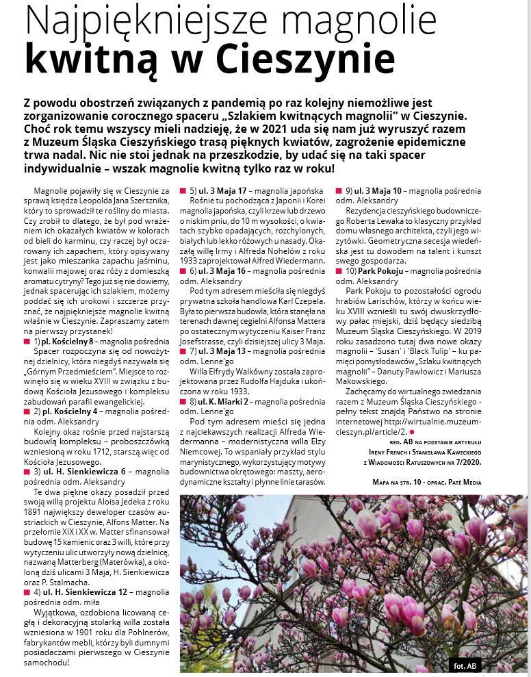 Z powodu obostrzeń związanych z pandemią niemożliwe jest zorganizowanie przez Muzeum Śląska Cieszyńskiego corocznego spaceru „szlakiem kwitnących magnolii” w Cieszynie. Jednak nic nie stoi na przeszkodzie, by udać się na taki spacer indywidualnie – wszak magnolie kwitną tylko raz w roku.