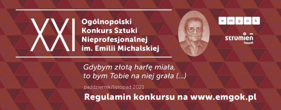 W terminie od 25 do 29 października 2021 r. w godzinach 8:00-16:00 w Miejsko-Gminnym Ośrodku Kultury w Strumieniu przyjmowane będą pracę do XXI Ogólnopolskiego Konkursu Sztuki Nieprofesjonalnej im. Emilii Michalskiej. Konkurs skierowany jest do twórców nieprofesjonalnych. Przyjmowane są prace uprzednio nienagradzane. Prace przyjmowane będą w kategoriach: