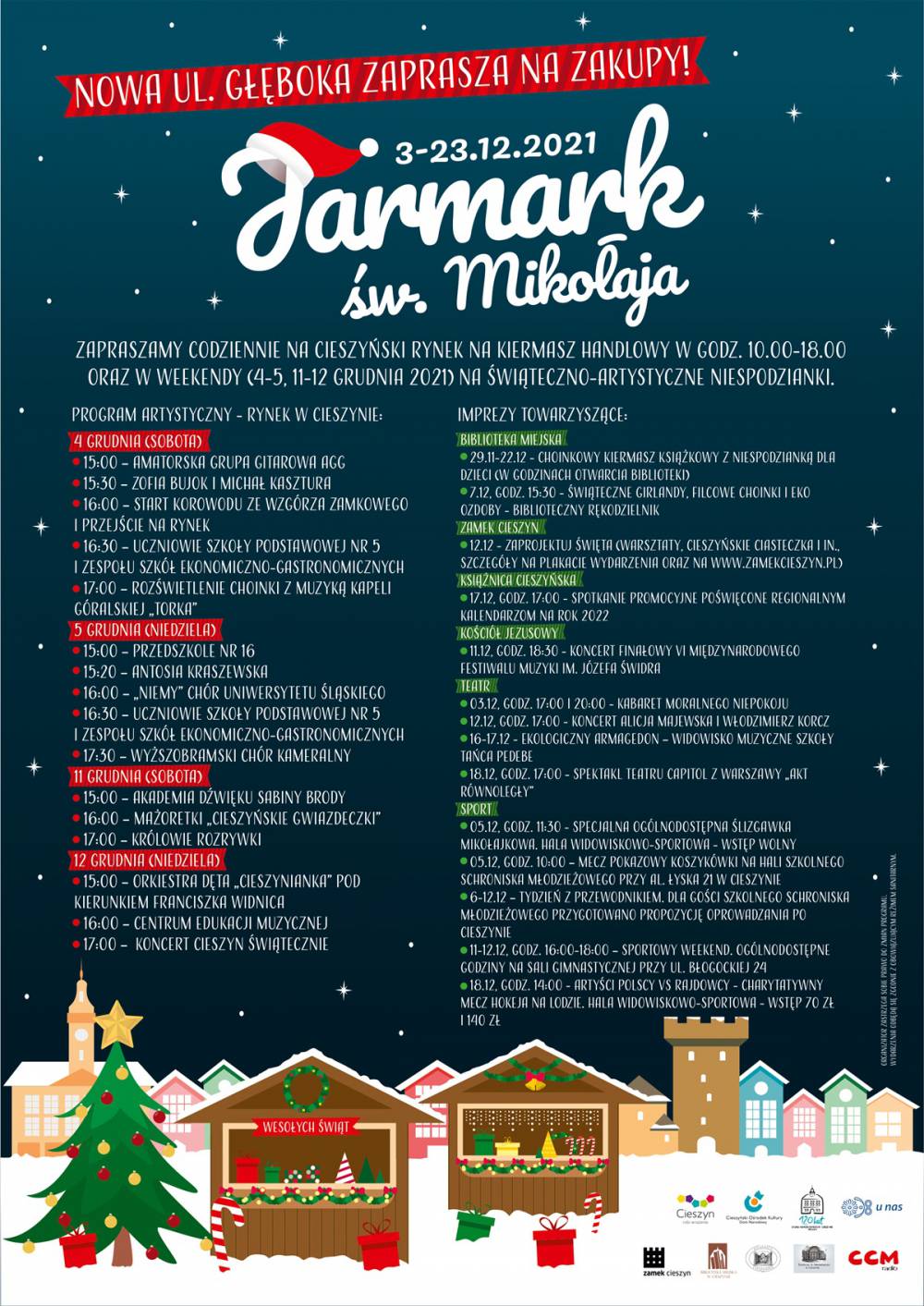 zapowiada się równie ekscytująco. Na scenie pojawią się dzieci z Przedszkola nr 16, a chwilę później Antosia Kraszewska zaśpiewa specjalnie dla nas, niosąc wraz ze swoim głosem grudniową nadzieję na cud. Tego dnia zobaczymy również „Niemy” Chór Uniwersytetu Śląskiego, uczniów Szkoły Podstawowej nr 5 i Zespołu Szkół Ekonomiczno-Gastronomicznych oraz Wyższobramski Chór Kameralny. W kolejną sobotę (11 grudnia) Jarmark św. Mikołaja wypełni się po brzegi Akademią Dźwięków Sabiny Brody, a prawdziwy pokaz swoich artystycznych umiejętności zaprezentują nam Mażoretki „Cieszyńskie Gwiazdeczki”. Sobotnie popołudnie zakończą Królowie Rozrywki. Scena na cieszyńskim Rynku będzie więc rozgrzana do czerwoności. 12 grudnia (niedziela) bawić nas będzie Orkiestra Dęta „Cieszynianka” pod kierunkiem Franciszka Widnica, ale nie tylko. Na scenie pojawią się również przedstawiciele Centrum Edukacji Muzycznej, a dzień zakończy wyjątkowy koncert „Cieszyn świątecznie”. Wydarzenia Towarzyszące Biblioteka Miejska znów zadba, by dzięki choinkowemu kiermaszowi książkowemu z niespodzianką na buziach najmłodszych mieszkańców zagościł szeroki uśmiech (29 listopada – 22 grudnia). W ramach "bibliotecznego rękodzielnika" powstaną tam świąteczne girlandy, filcowe choinki i eko ozdoby (7 grudnia). Zamek Cieszyn tradycyjnie już zaprosi nas na wydarzenie pod nazwą Zaprojektuj Święta (12 grudnia), które wypełnione będzie po brzegi wszystkim tym, co miłe, smaczne i przyjemne, serwując nam na deser konkurs na cieszyńskie ciasteczka. Zaś 17 grudnia Książnica Cieszyńska zaprosi nas na spotkanie promocyjne poświęcone regionalnym kalendarzom na rok 2022.