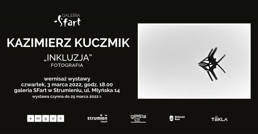 Miejsko-Gminny Ośrodek Kultury w Strumieniu (emgok) zaprasza na wernisaż wystawy fotografii Kazimierza Kuczmika pt. „INKLUZJA”. Otwarcie wystawy odbędzie się w czwartek, 3 marca 2022 r. o godzinie 18:00 w Galerii SFart w holu strumieńskiego emgoku. Ekspozycja będzie czynna dla zwiedzających do 25 marca 2022 r. w godzinach pracy Ośrodka Kultury.