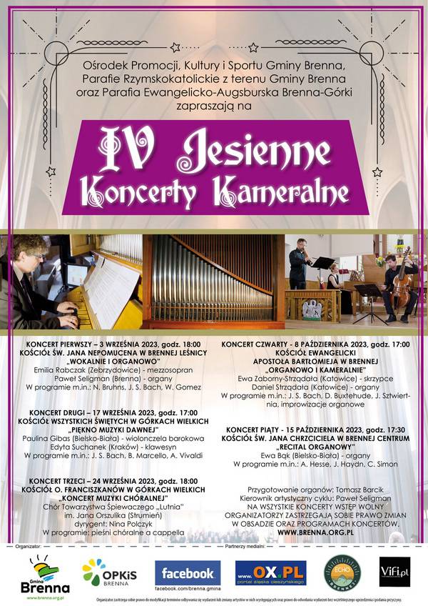 Ośrodek Promocji, Kultury i Sportu Gminy Brenna, Parafie Rzymskokatolickie z terenu Gminy Brenna oraz Parafia Ewangelicko-Augsburska Brenna-Górki zapraszają na "IV Jesienne Koncerty Kameralne"
