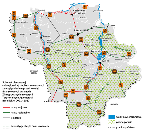 Z ww. puli środków zrealizowane zostaną spójne elementy sieci regionalnych tras rowerowych (RTR) w oparciu o założenia Regionalnej Polityki Rowerowej Województwa Śląskiego oraz Planu Zrównoważonej Mobilności dla Aglomeracji Beskidzkiej 2040+: