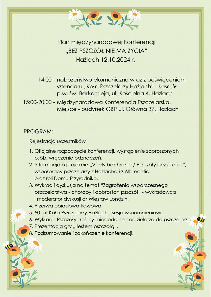 Jednym z elementów projektu jest Międzynarodowa Konferencja Pszczelarska, która odbędzie się 12.10.2024 r. w Hażlachu w budynku Biblioteki. Początek o godzinie 15.00.