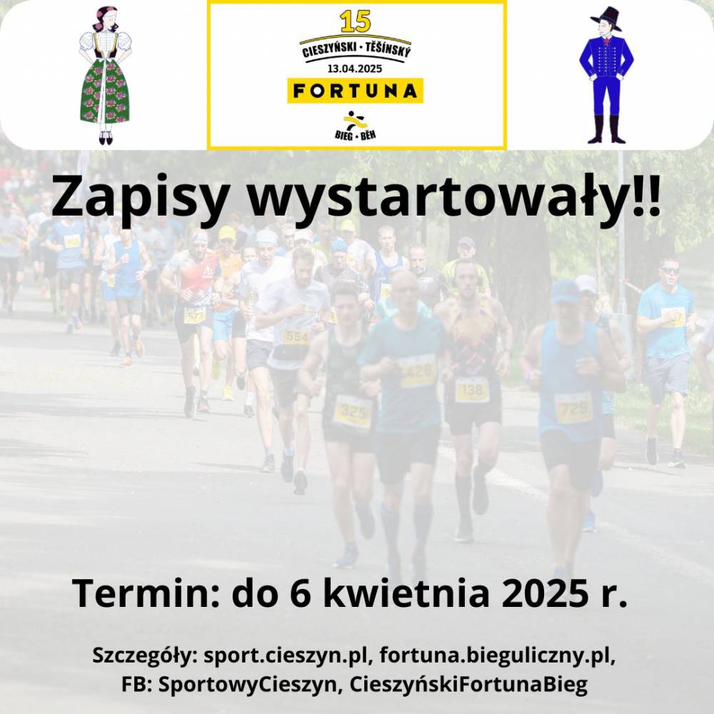 Wydział Sportu Urzędu Miejskiego w Cieszynie informuje, że wystartowały zapisy na 15. Cieszyński FORTUNA Bieg, który odbędzie się 13 kwietnia 2025r.