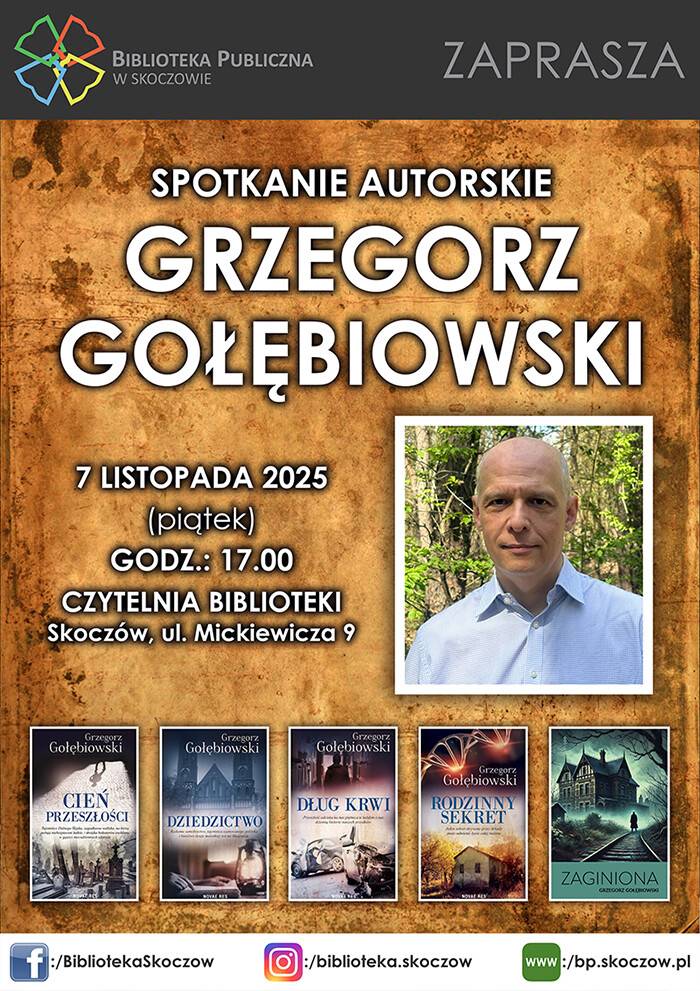 7 listopada zapraszamy na spotkanie autorskie z Grzegorzem Gołębiowskim - autorem cyklu powieści, których głównym bohaterem jest genealog Adam Floriański ("Cień przeszłości", "Dziedzictwo", "Dług krwi" oraz "Rodzinny sekret"), a także wydanego w tym roku kryminału "Zaginiona".