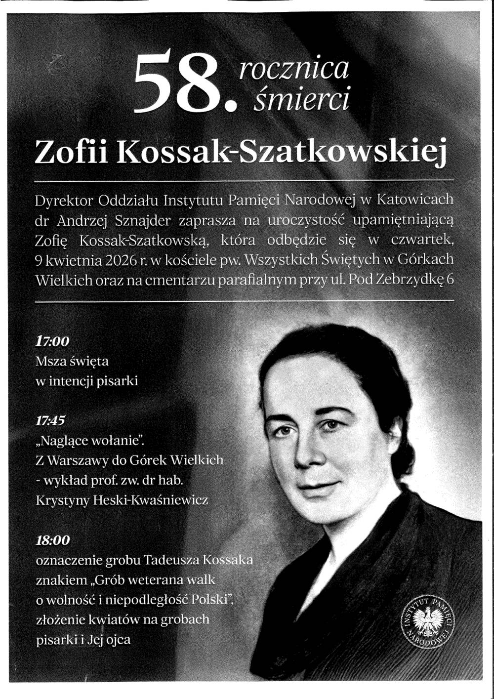 Dyrektor Oddziału Instytutu Pamięci Narodowej w Katowicach zaprasza na uroczystość upamiętniającą 58. rocznicę śmierci Zofii Kossak-Szatkowskiej – wybitnej polskiej pisarki i działaczki niepodległościowej.