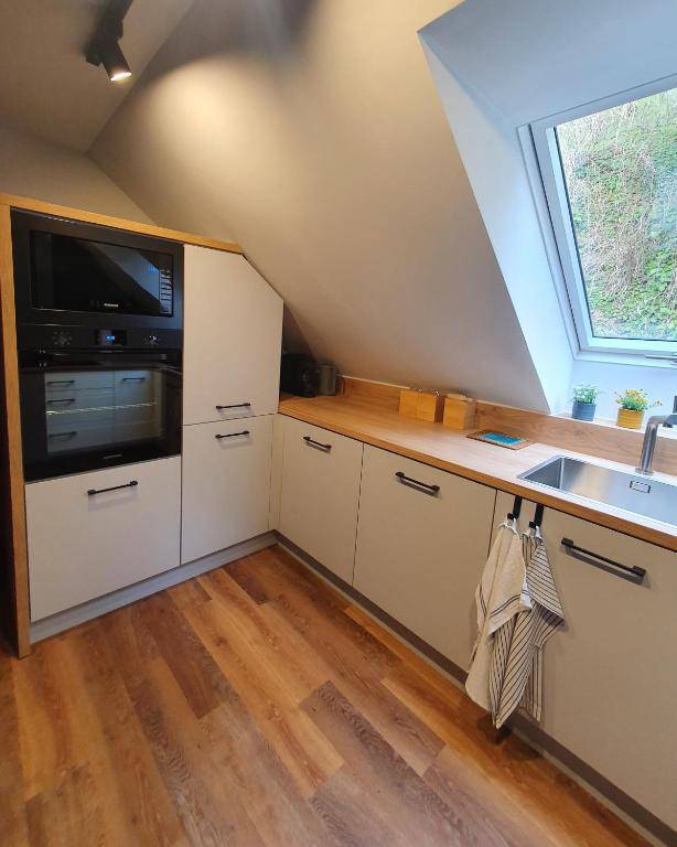 Domek z apartamentami zlokalizowany jest w centrum miasta. Do rynku czy na wzgórze zamkowe mamy kilka minut. Apartamenty przygotowane są do pobytu z wyżywieniem we własnym zakresie, posiadają bardzo dobrze wyposażone kuchnie, miejsce do wypoczynku w ogrodzie oraz prywatny, bezpłatny parking. Apartamenty są klimatyzowane. Dostępny jest także bezprzewodowy internet. Do dyspozycji Gości jest też taras, a z okien roztacza się widok na rzekę. W przypadku każdego z apartamentów na życzenie Państwa możemy wstawić łóżeczko, krzesełko i inne akcesoria dla dzieci do lat 3, bezpłatnie.