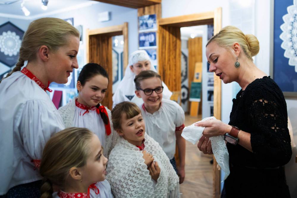 Koniaków, kustoszka Muzeum Koronki Koniakowskiej mgr Lucyna Ligocka-Kohut wprowadza młode adeptki w tajniki koniakowskiej koronki, foto Archiwum Muzeum Koronki koniakowskiej