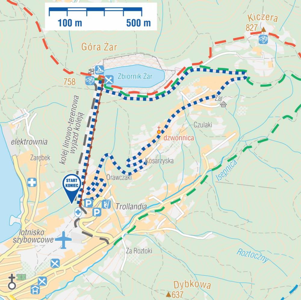 Parkujemy SAM i BUS w Międzybrodziu Żywieckim, na parkingu przy ul. Górskiej obok Górskiej Szkoły Szybowcowej. Przechodzimy przez jezdnię do dolnej stacji kolei linowo-terenowej na Górę Żar. Wyjeżdżamy KOLEJKĄ NA GÓRĘ ŻAR (761 m n.p.m.). Przy górnej stacji znajduje się kilka punktów gastronomicznych, restauracja, opisane panoramy widokowe, lunety, tor saneczkowy oraz górny zbiornik elektrowni Porąbka-Żar.