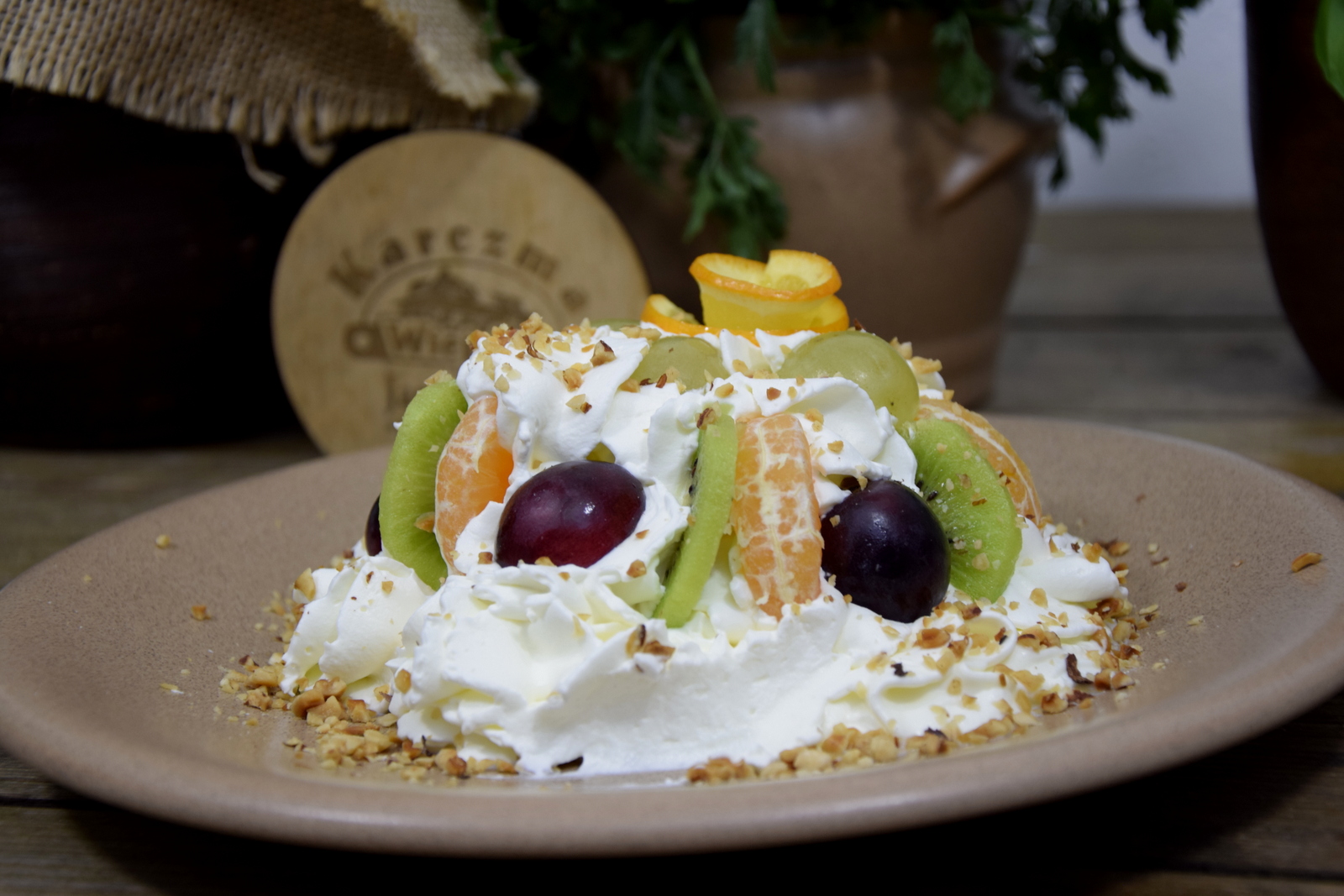 Kruszony biszkopt ugniatamy z masłem i bakaliami (orzechami, kokosem, rodzynkami) i nasączamy żubrówką. Podajemy na talerzu z bitą śmietaną oraz gruszką o aromacie anyżu w formie wypukłej kopy przyozdobionej melisą.
