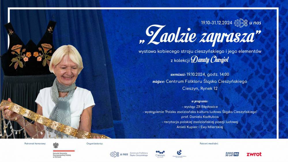 Cieszyński Ośrodek Kultury "Dom Narodowy" zaprasza na wystawę kobiecego stroju cieszyńskiego i jego elementów z kolekcji Danuty Chwajol.  Otwarcie wystawy "Zaolzie zaprasza" i jej wernisaż odbędzie się w sobotę, 19 października o godzinie 14:00 w Centrum Folkloru Śląska Cieszyńskiego na drugim piętrze Domu Narodowego w Cieszynie. Ekspozycja będzie dostępna dla zwiedzających do 31 grudnia 2024, w godzinach pracy Ośrodka Kultury.