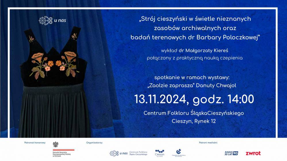 Cieszyński Ośrodek Kultury COK "Dom Narodowy" zaprasza na wykład organizowany w ramach działalności Centrum Folkloru Śląska Cieszyńskiego pt. "Strój cieszyński w świetle nieznanych zasobów archiwalnych oraz badań terenowych dr Barbary Poloczkowej". Wykład połączony z praktyczną nauką czepienia wygłosi dr Małgorzata Kiereś, w środę 13 listopada 2024 o godzinie 14:00, w Centrum Folkloru Śląska Cieszyńskiego na drugim piętrze Domu Narodowego w Cieszynie. Spotkanie w ramach wystawy strojów cieszyńskich "Zaolzie Zaprasza" z kolekcji Danuty Chwajol.