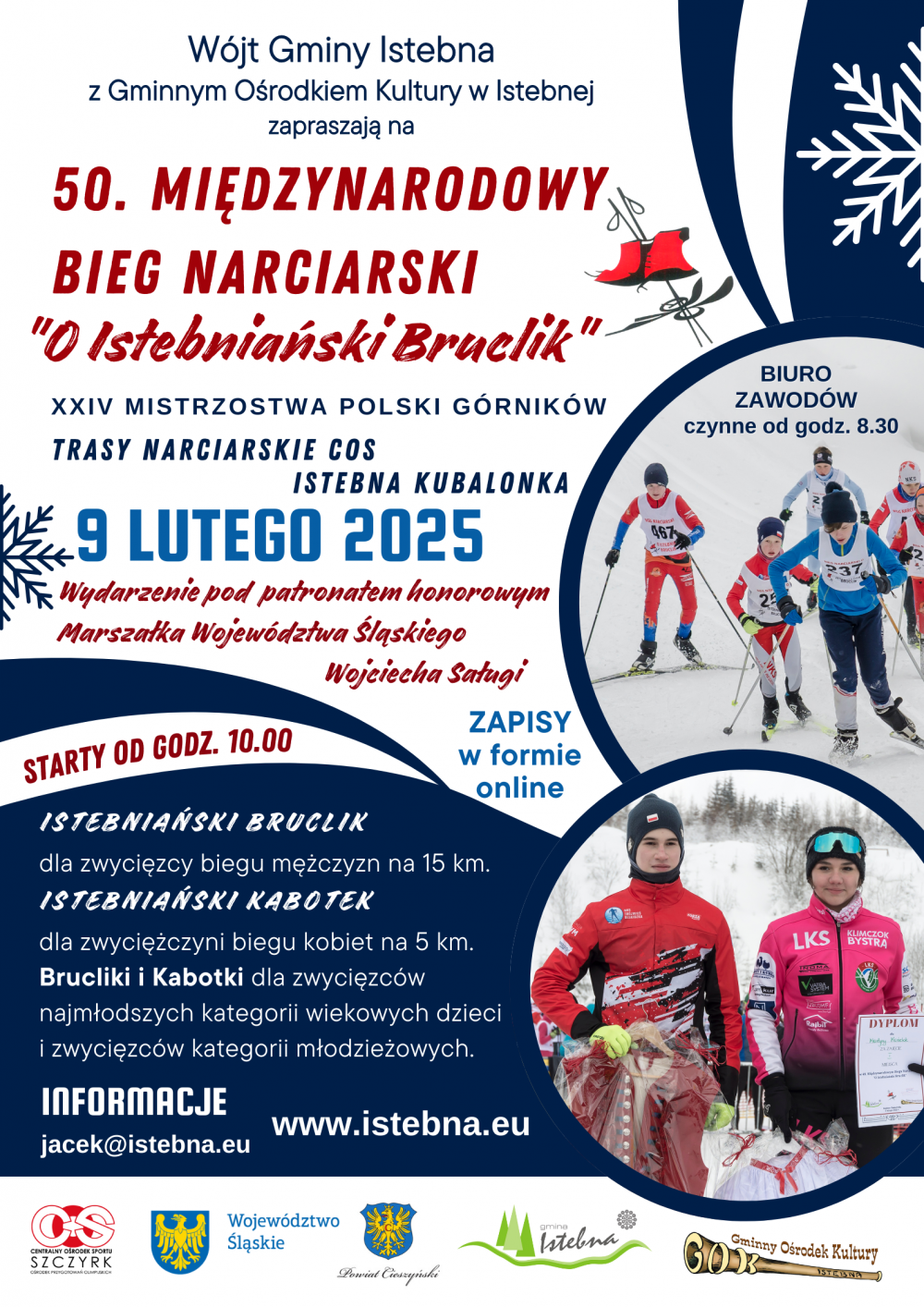 Już po raz 50. zapraszamy wszystkich amatorów biegania oraz zdrowego trybu życia do udziału w kultowym Międzynarodowym Biegu o Istebniański Bruclik, który odbędzie się w niedzielę 9 lutego 2025 roku na trasach COS w Istebnej Kubalonce.