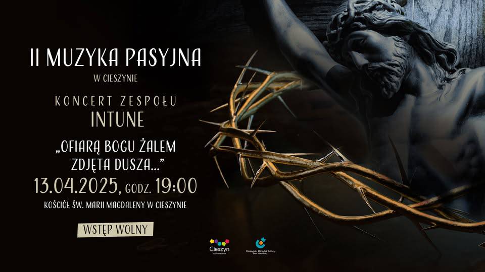 Cieszyński Ośrodek Kultury "Dom Narodowy" zaprasza na koncert zespołu InTune pt. "Ofiarą Bogu żalem zdjęcia dusza...", w ramach cyklu Muzyka Pasyjna w Cieszynie. Wydarzenie odbędzie się w niedzielę 13 kwietnia o godzinie 19:00 w Kościele św. Marii Magdaleny w Cieszynie.