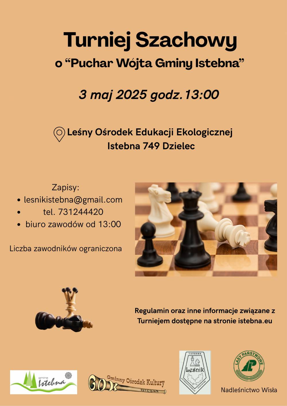 Zapraszamy wszystkich miłośników królewskiej gry do udziału w Turnieju o Puchar Wójta Gminy Istebna, który odbędzie się w sobotę 3 maja w Leśnym Ośrodku Edukacji Ekologicznej w Istebnej Dzielcu.