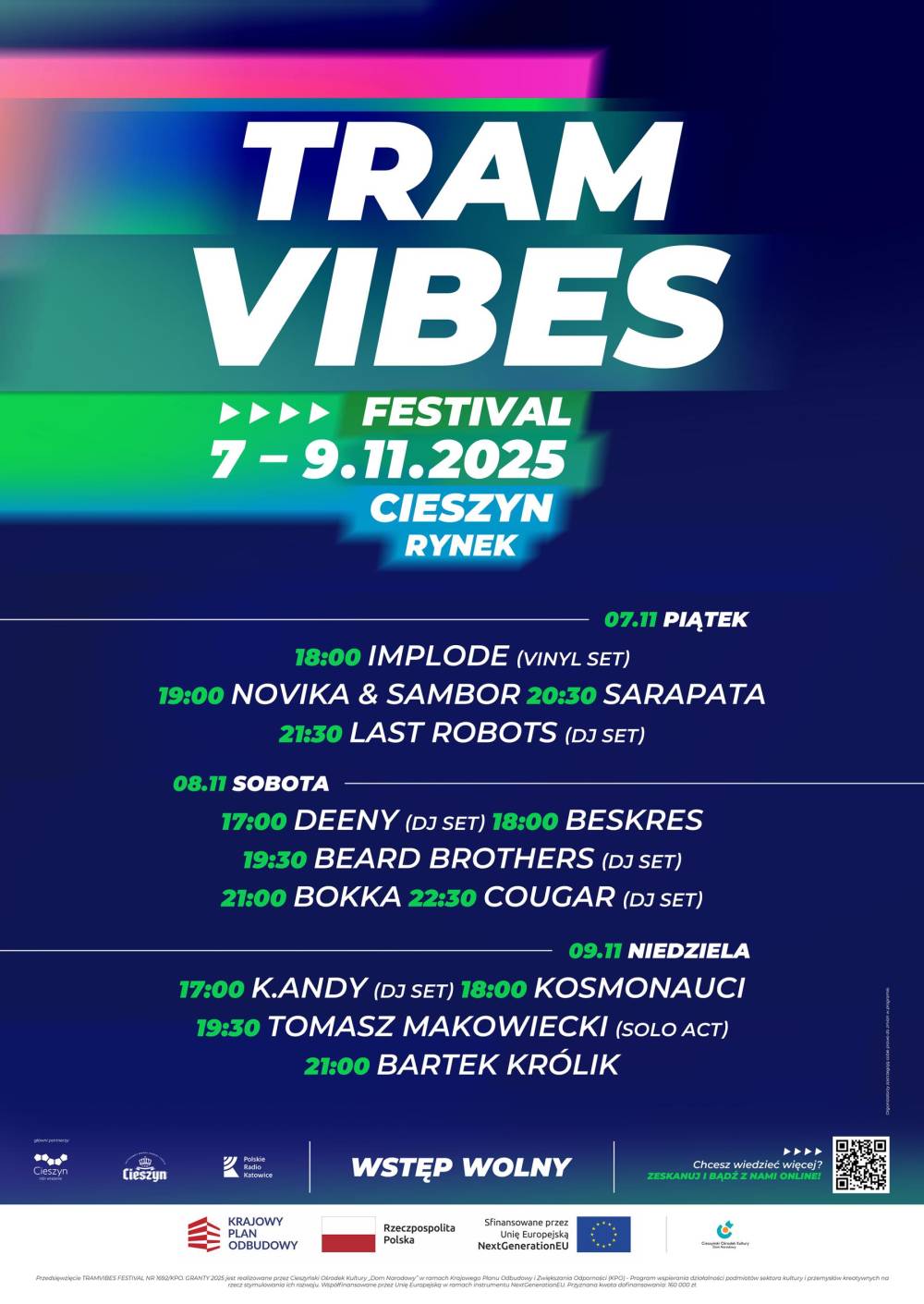 Cieszyński Ośrodek Kultury "Dom Narodowy" zaprasza na zupełnie nowy festiwal muzyczny w kulturalnym kalendarzu Cieszyna!  W dniach 7-9 listopada 2025 odbędzie się pierwsza edycja TRAMVIBES FESTIVALU, nadającego nowy rytm miastu.