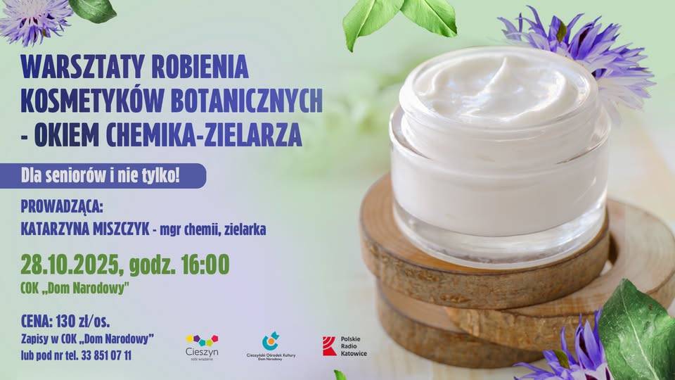 Cieszyński Ośrodek Kultury "Dom Narodowy" zaprasza na warsztaty z wykonywania kremów botanicznych (z surowców pochodzenia roślinnego).  Wydarzenie odbędzie się we wtorek, 28 października 2025 r. o godzinie 16:00 w Domu Narodowym. Warsztaty prowadzi mgr chemii Katarzyna Miszczyk, absolwentka Kursu Zielarstwa i Fitoterapii. Wspólnie wykonamy dwa kremy i balsam do ciała.