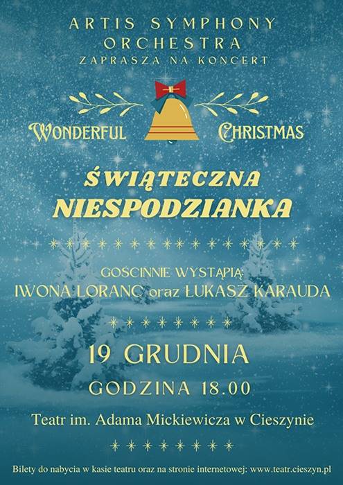 Zapraszamy na koncert „Świąteczna niespodzianka” - Wonderful Christmas w wykonaniu Artis Symphony Orchestra, który w całości będzie niespodzianką. Koncert odbędzie się 19 grudnia 2025 w Teatrze im. Adama Mickiewicza w Cieszynie.