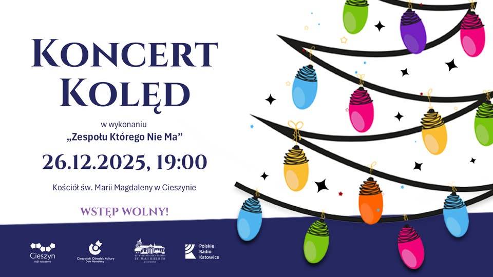 Cieszyński Ośrodek Kultury "Dom Narodowy" zaprasza na koncert kolęd w wykonaniu ZESPOŁU, KTÓREGO NIE MA.  Wydarzenie odbędzie się w piątek 26 grudnia 2025 o godzinie 19:00 w Kościele św. Marii Magdaleny w Cieszynie.