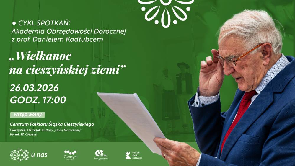 Cieszyński Ośrodek Kultury "Dom Narodowy" zaprasza na spotkanie z wybitnym znawcą kultury, tradycji i języka Śląska Cieszyńskiego, profesorem Danielem Kadłubcem. W czwartek 26 marca 2026 r. o godzinie 17:00 w Centrum Folkloru Śląska Cieszyńskiego, na drugim piętrze Domu Narodowego w Cieszynie odbędzie się spotkanie pt. "Wielkanoc na cieszyńskiej ziemi", podczas którego odkrywać będziemy wspólnie kolejny wycinek bogactwa tradycji Śląska Cieszyńskiego, związany z obchodami Wielkanocy. Serdecznie zapraszamy!