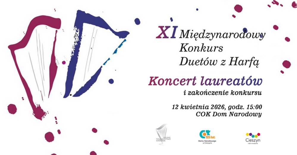 Cieszyński Ośrodek Kultury "Dom Narodowy", Centrum Edukacji Artystycznej i Polskie Towarzystwo Harfowe zapraszają na Koncert Laureatów 11. Międzynarodowego Konkursu Duetów z Harfą. Wydarzenie odbędzie się w najbliższą niedzielę 12 kwietnia 2026, o godzinie 15:00 w sali widowiskowej Domu Narodowego w Cieszynie.