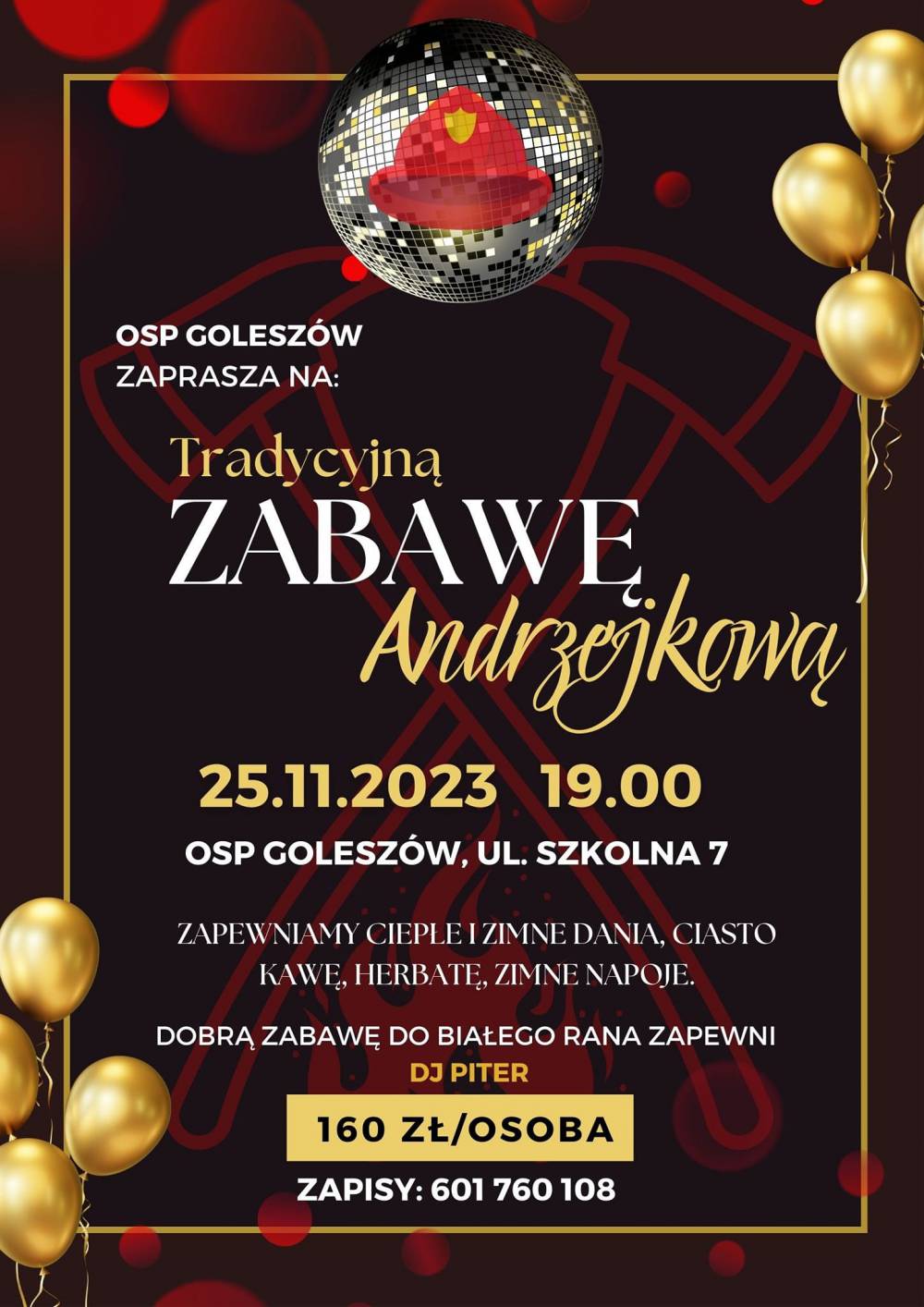 Ochotnicza Straż Pożarna w Goleszowie zaprasza na tradycyjną Zabawę Andrzejkową, która odbędzie się w sobotę, 25 listopada o godz. 19:00 w strażnicy OSP przy ul. Szkolnej 7 w Goleszowie. Organizatorzy zapewniają ciepłne i zimne dania, ciasto, kawę, herbatę, zimne napoje oraz dobrą zabawę do białego rana, o którą zadba DJ Piter.