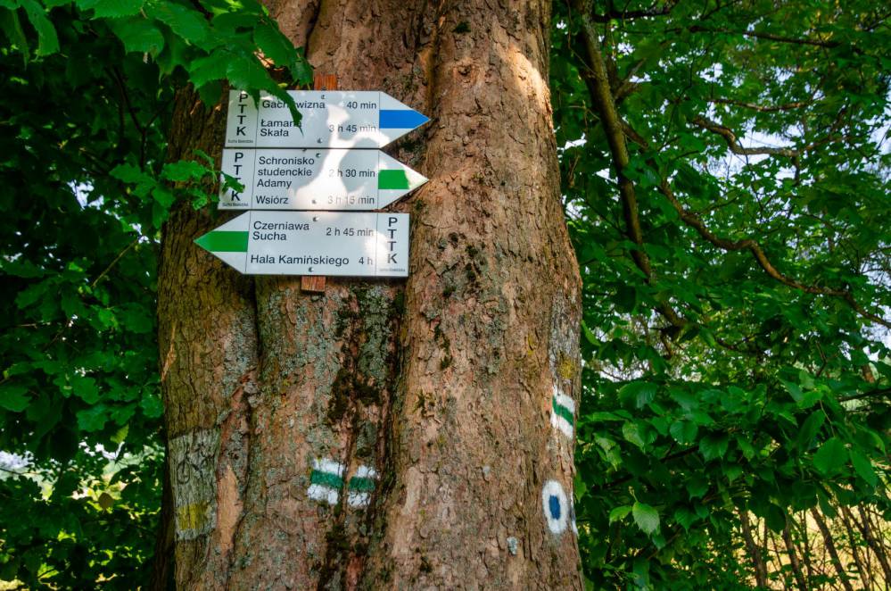 Szlak: żółty z Jeleśni do rozstaju pod szczytem Gachowizny, niebieski z Gachowizny do Huciska